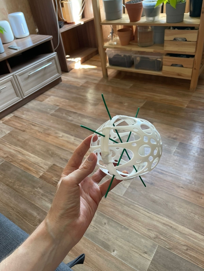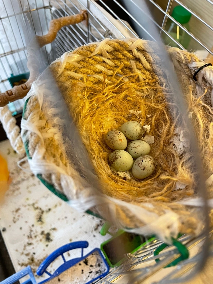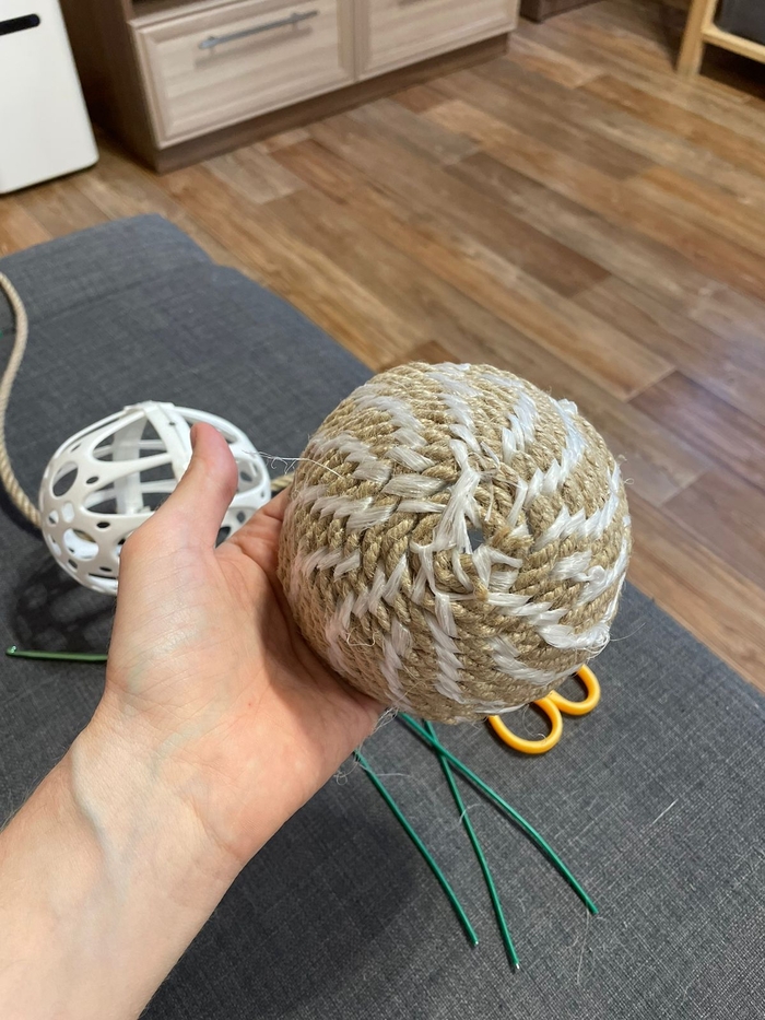 Всем привет! Ниже представлены фото вашему вниманию. Все делал в первый раз, своими ручонками. Мама Рыжая - довольна. Наполнение гнезда - порезанный на кусочки джутовый шпагат и раскрученный. Основа для плетения гнезда - контейнер для стирки лифчиков