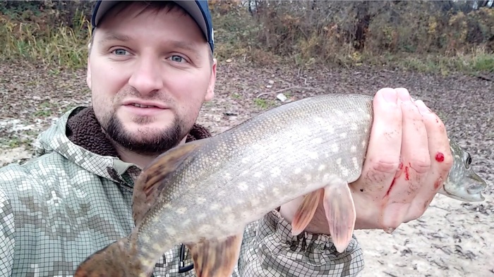 Через 10 минут тишины случается то, чего я не ожидал от такой небольшой приманки. Резким ударом на крючок садится щука (очень кстати я с утра поставил флюорокарбоновый поводок). После короткой борьбы щука на берегу и я понимаю, что оставил корнцанг (хирургический зажим) в машине. Пока доставал из щучей пасти крючок до крови порезал руки. Вроде умудрился не повредить ей жабры, глубоко заглотила. После небольшой видеосъемки щука была отпущена.
