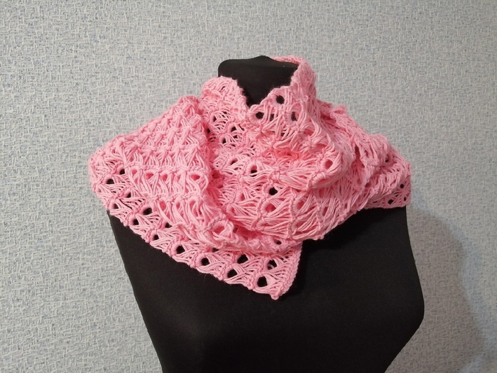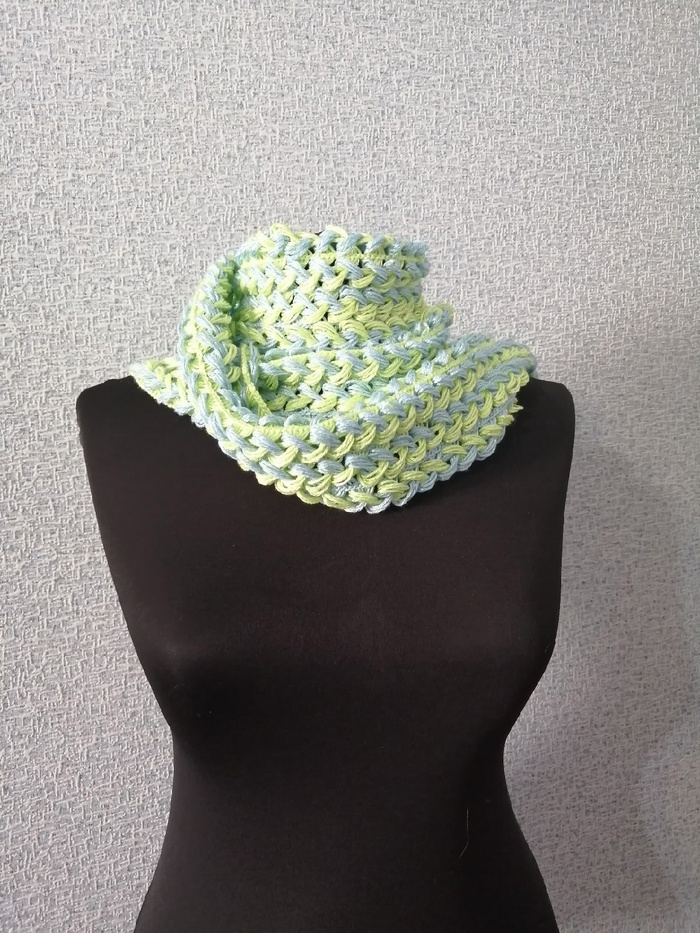 Снуд для сестренки. Из чего, честно не помню, я тогда не особо умела выбирать пряжу)). Но носитель, вроде, довольна.