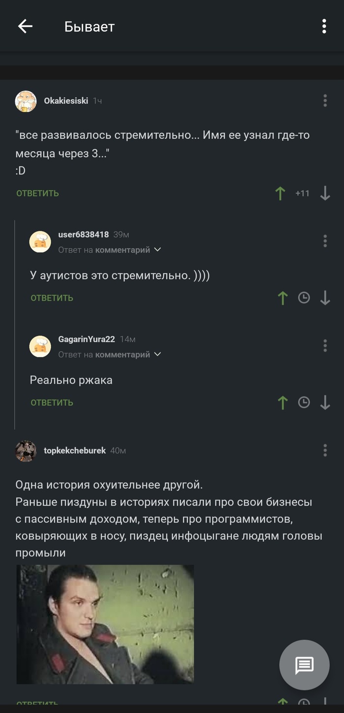 значитса, так. Года 3 назад в телегах нашла гифку, от которой смеялась каждый раз как в первый: ночь, какой-то кирпичный или каменный забор на котором сидят спиной к оператору голые чюваки. И начинают спрыгивать с забора, копируя жабье поведение.
