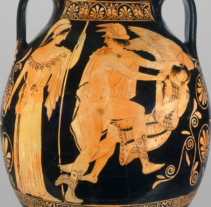 Эти разночтения не имеют для нас концептуальной значимости, потому что даже когда Персей подходит к спящим Горгонам, он все равно старается не смотреть на них. В качестве примера такого источника можно взять любой античный сосуд, в росписи которого присутствует миф о Персее и Медузе. Почти на всех изображениях герой отворачивается. Обращаю внимание – он отворачивается даже от спящей Медузы!