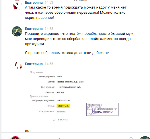Немного пошаманив на сайте сбера с кодом страницы, получаю подобие чека и отсылаю мошеннице.