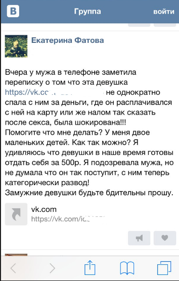 Оказывается, после неудачной сделки дамочка в одной из групп выложила вот такой вот пост с ссылкой на мою страницу. Группу я эту не нашла, да и не искала особо)