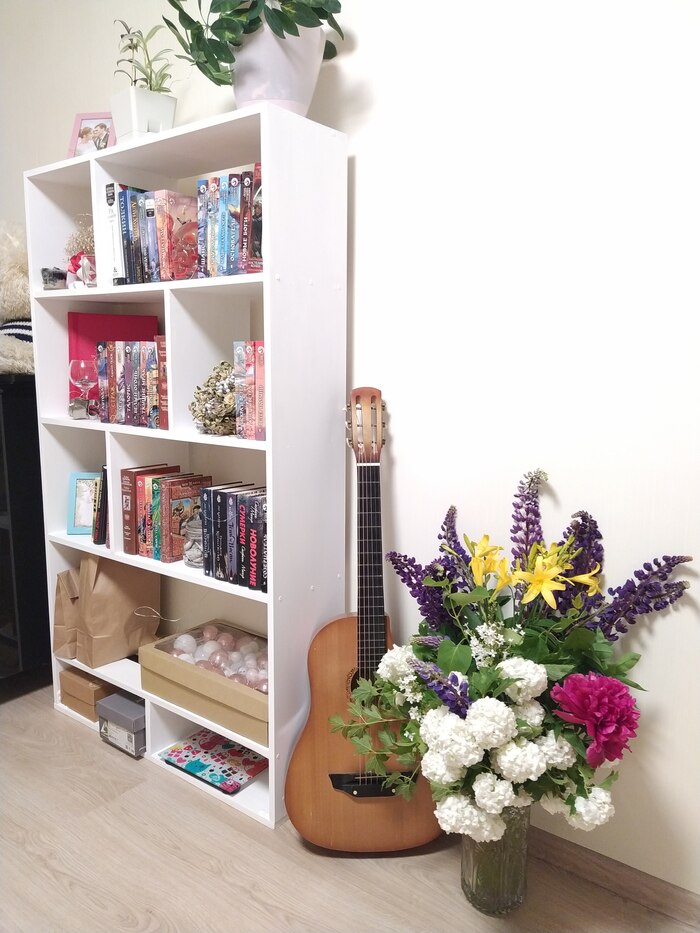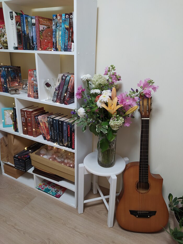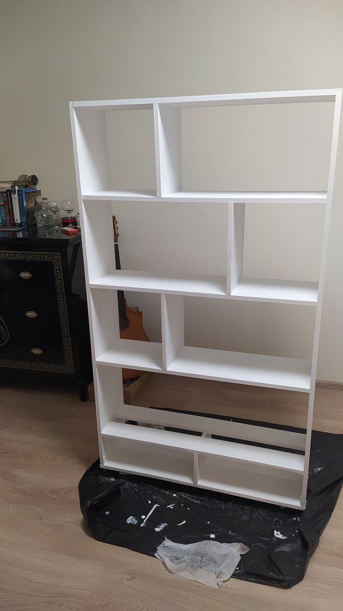 Дальше шпаклевали (или шпатлевали? 🧐) и красили в несколько слоёв акриловой белой краской в несколько слоёв (а так же полы, стены, гитару и себя😅)