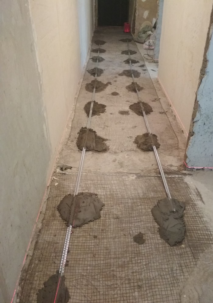Ближе к вечеру я решил что маяки достаточно подсохли и можно начать закладывать стяжку.