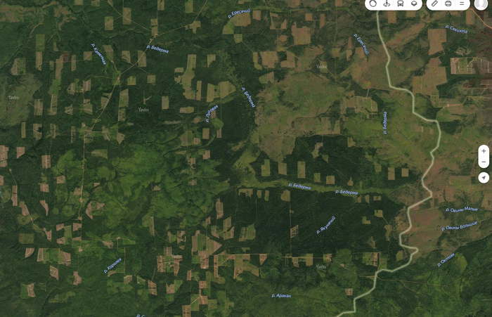 Давеча разглядывал, по работе, Яндекс. карты, и решил показать коллеге, пресловутую съемку вырубки тайги. Многие видели, многие нет, зрелище конечно удручающее.