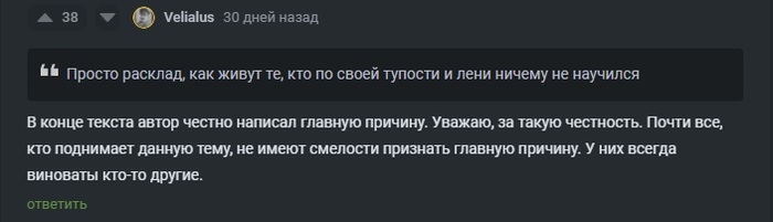Просто расклад, как живут те, кто по своей тупости и лени ничему не научился и никому не нужен.