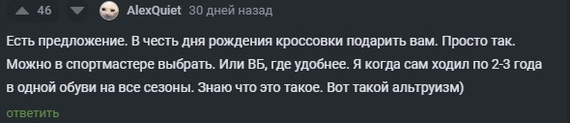 Очень много людей были добры ко мне. Давали советы, сочувствовали, был даже господин @AlexQuiet, предложивший мне оплатить кроссы, потому что мои на последнем издыхе, но я тогда отказался, ссылаясь на то, что еще верю в свои силы.