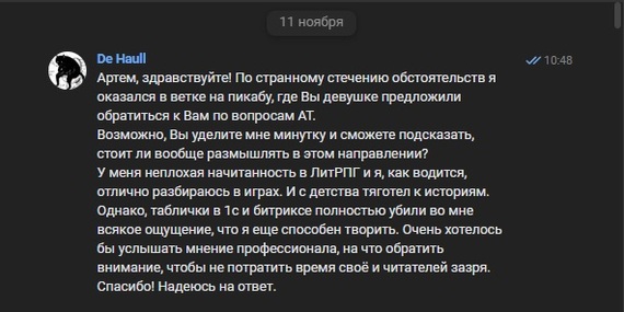 В комментариях к посту #comment_32866044 некий Артем Сластин предложил топикстартеру помощь в адаптации в мире писательского ремесла. Кто и что меня дернуло в тот момент перейти в диалог вк до сих пор остается загадкой, но я написал.