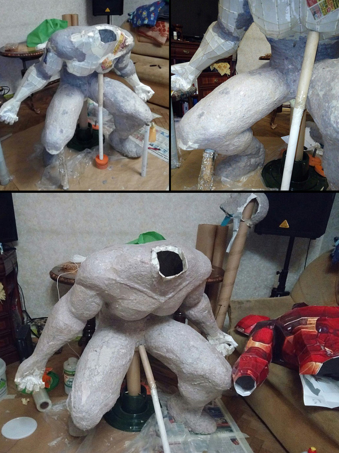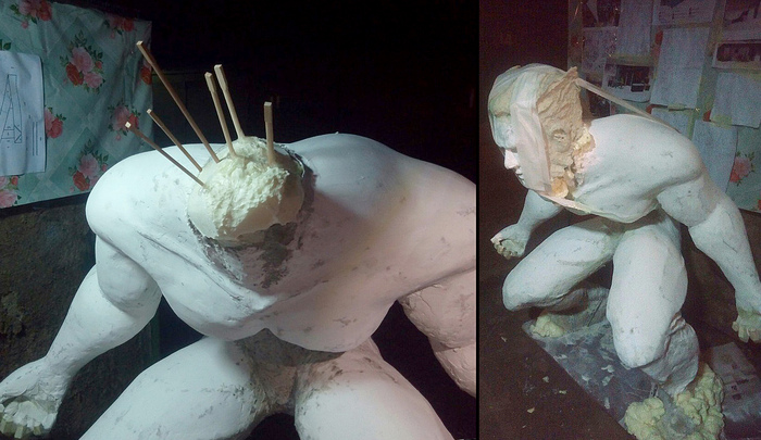 В несколько слоев обклеивали и обмазывали папье-маше, в нашем случае - размолотые в кашу газеты+ПВА+алебастр. Фигура получилась полой внутри и чертовски легкой.