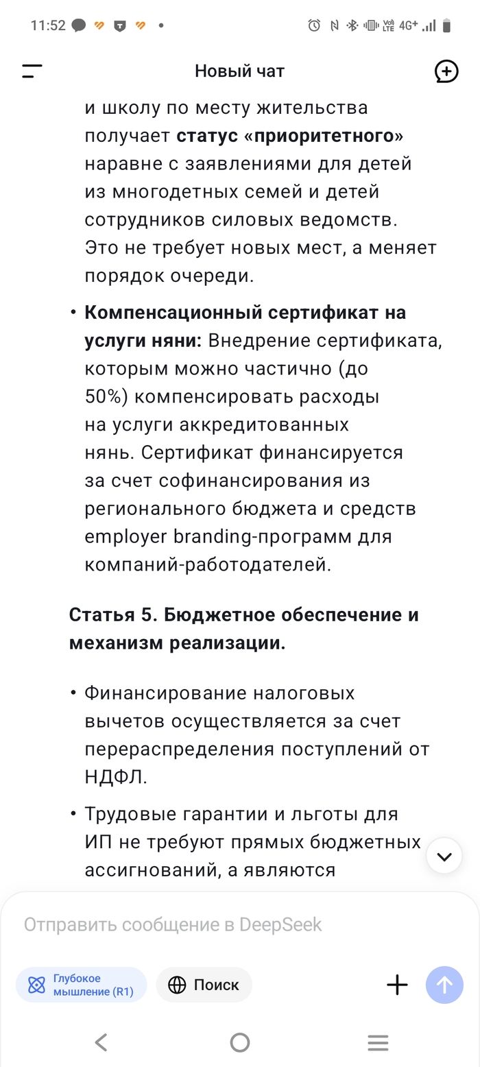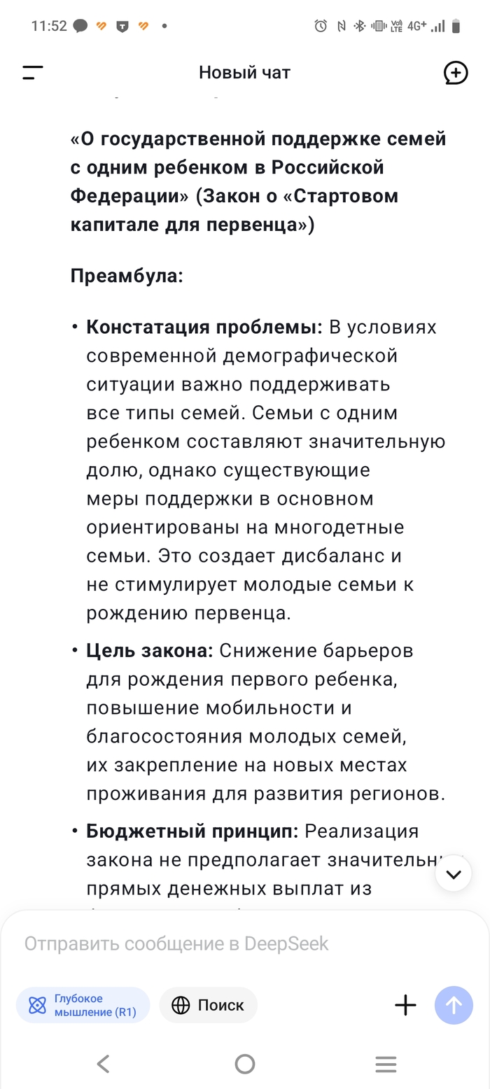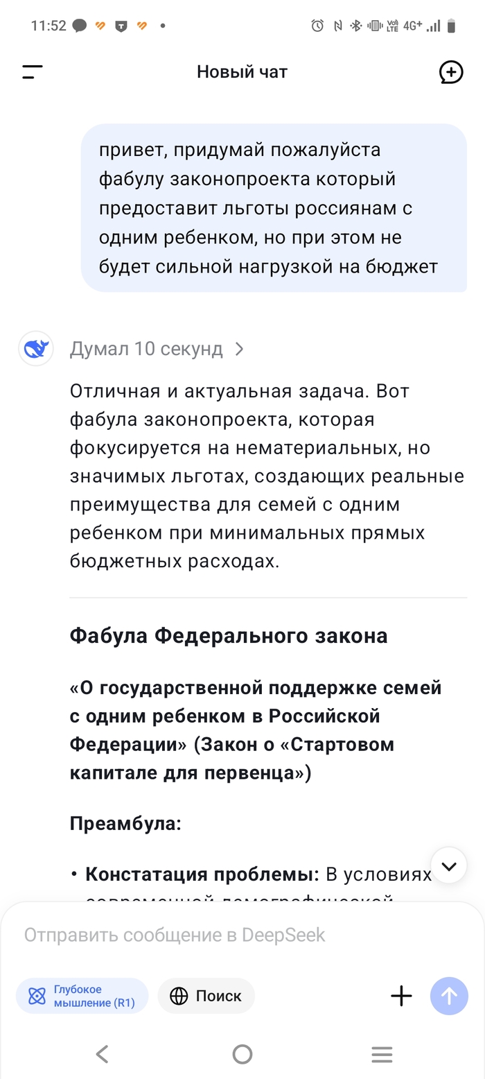 Я решила проверить, что предложит дипсик на мой запрос о законопроекте для поддержки семей с одним ребенком. Для сохранения баланса между интересами государства и народа я указала, что хочу чтобы новый закон несильно бил по бюджету, то что получилось в итоге на фото