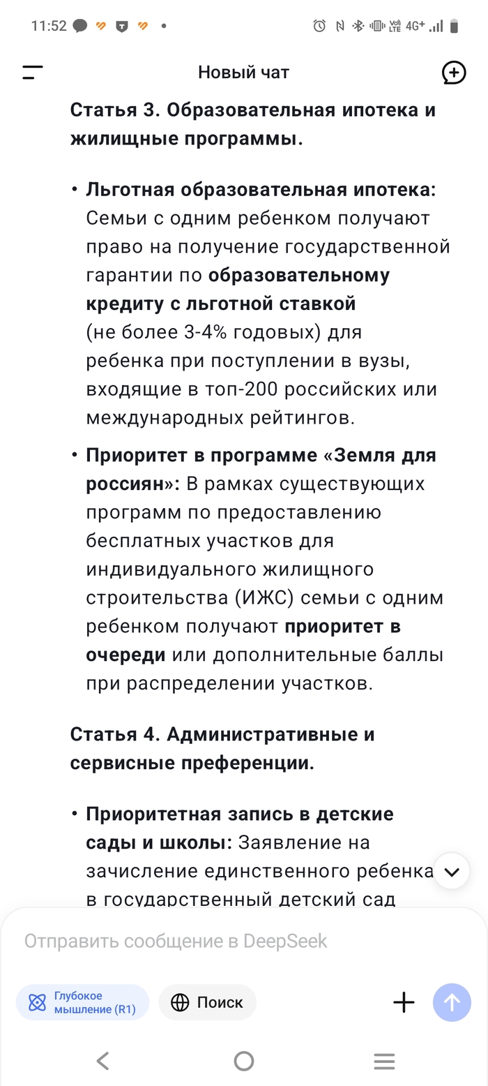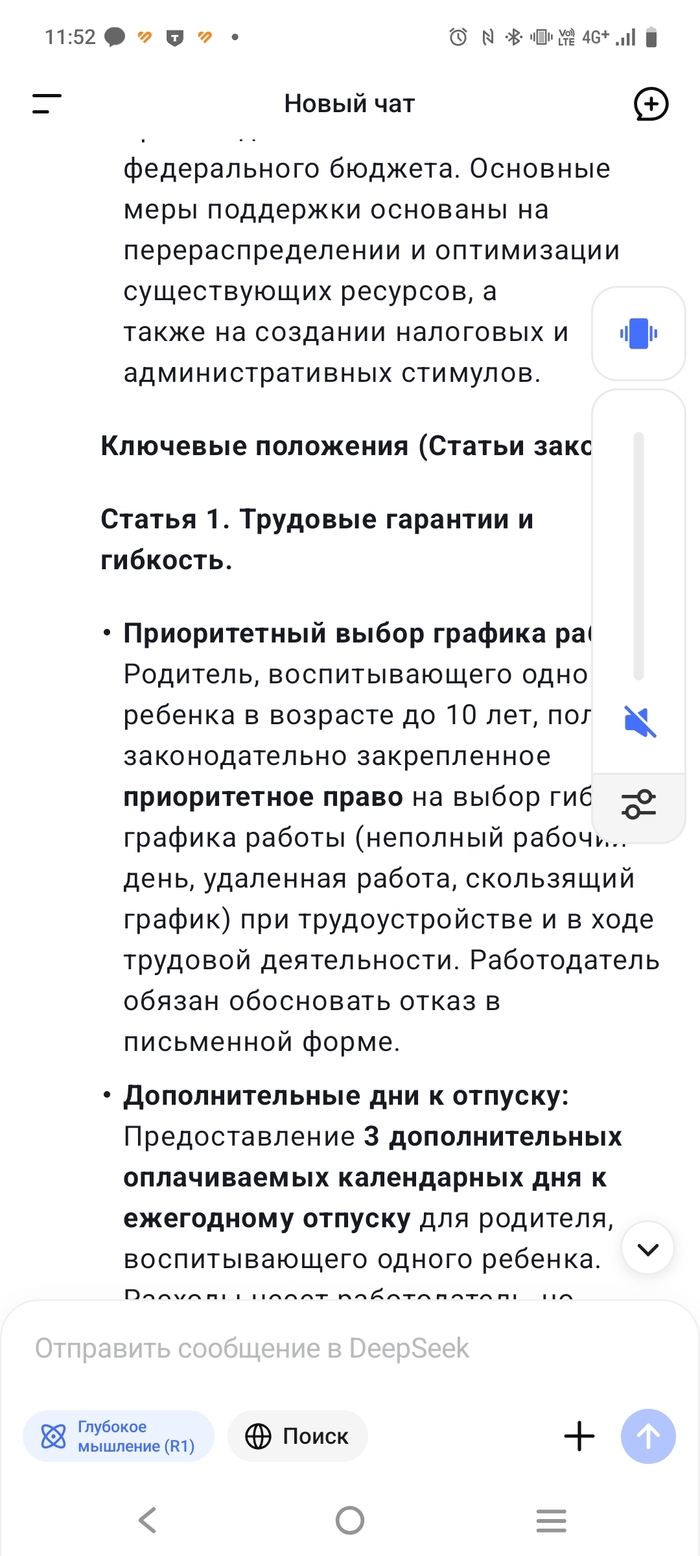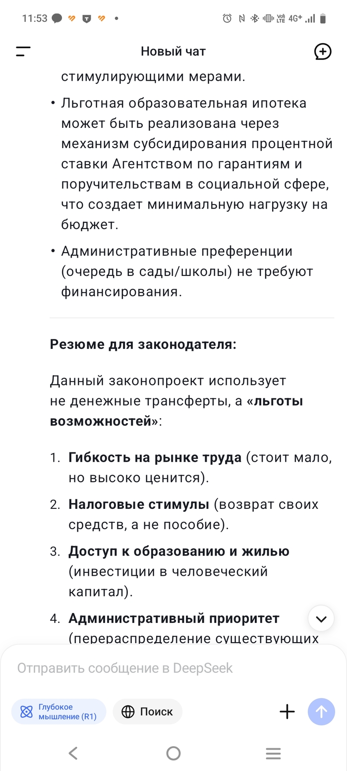 Я решила проверить, что предложит дипсик на мой запрос о законопроекте для поддержки семей с одним ребенком. Для сохранения баланса между интересами государства и народа я указала, что хочу чтобы новый закон несильно бил по бюджету, то что получилось в итоге на фото