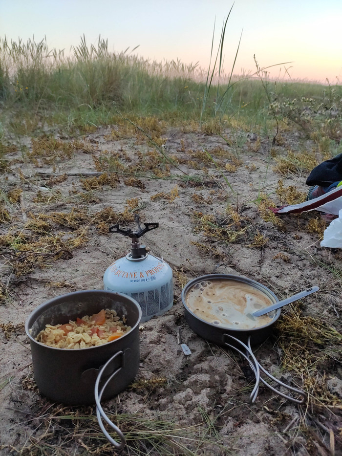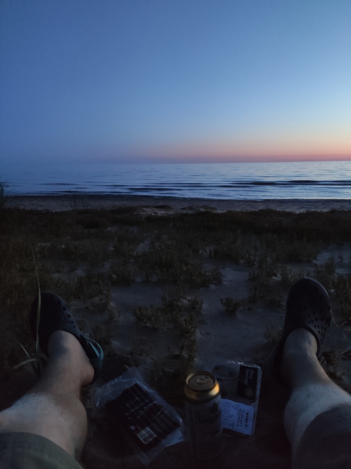 Уже совсем темнеет и встаю на ночевку, ужинаю пивом и мясом с видом на море. хорошо.