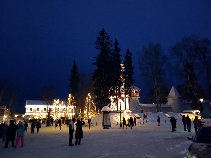 В этот морозный рождественский вечер в 60 км от Пскова, почти на самой границе с Европой очень людно. Я, например, еле припарковался поодаль, побуксовав в сугробе. Говорят, тут можно встретить отнюдь не только псковичей, но и очень известных личностей, жаждущих духовности.