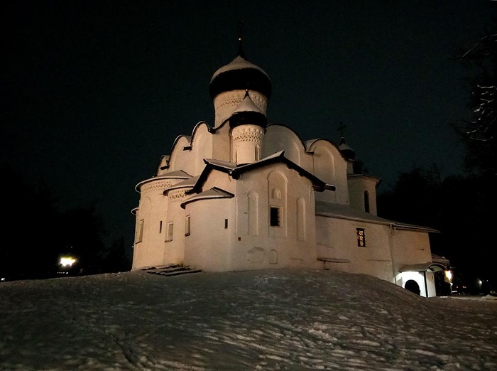 Сам храм Михаила Архангела в иллюминации. У него вокруг барабана идет пояс из уникальной мозаики. Если приедете в Псков, то экскурсоводы обязательно про него расскажут.