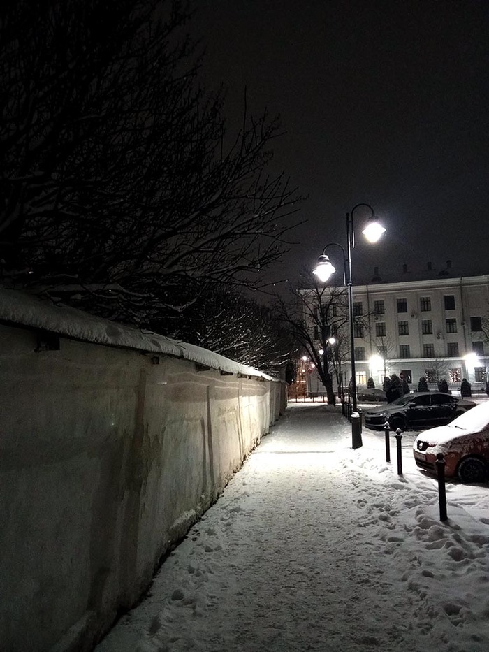 Обычные улочки Старого Пскова. Тут тихо, горят фонари, снежок сыпет себе к неудовольствию городских снегоуборщиков.