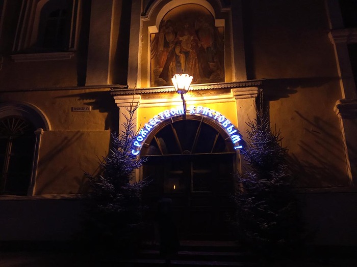 Внизу украшений и иллюминации почти не было, что и правильно - территория обители все-таки. Церковь, которая над пещерами (да, монастырь знаменит именно пещерами, потому и называется город - Печоры), уже закрыта, а телефон в темноте фотографирует плохо. Еще и пальцы рук мерзнут. Температура воздуха примерно минус одиннадцать. Давненько я не встречал в наших краях "правильного" Рождества со снегом и умеренным морозом.