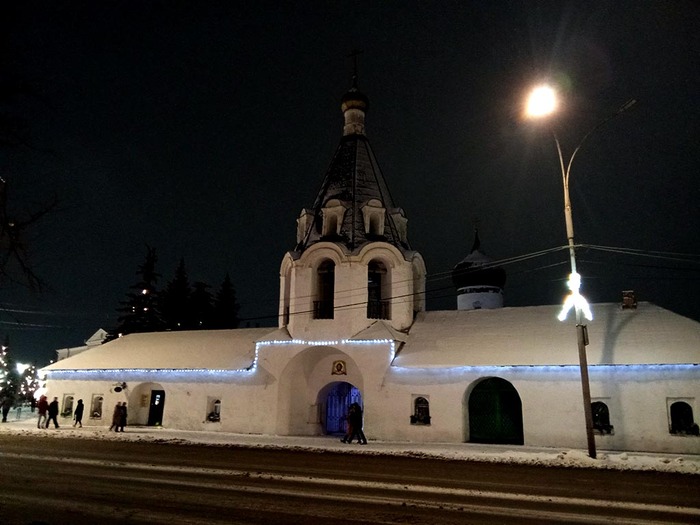 Вход в монастырь. Надвратная Башня, она же Петровская. Ярко горит надпись "С Рождеством Христовым". Горит она ярче, чем у меня на фото, если что.