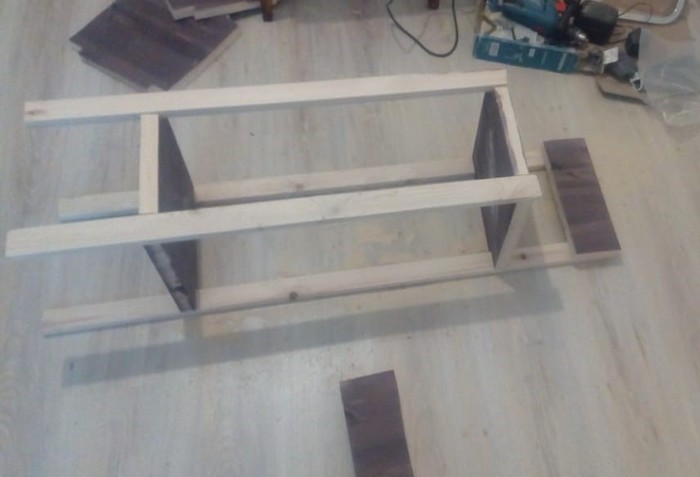 У меня оставались какие-то обрезки, доски, щиты от предыдущих поделок. И еще у меня был электрический лобзик, который я позаимствовал у брата. И я собрал в шутку вот такую штуку: