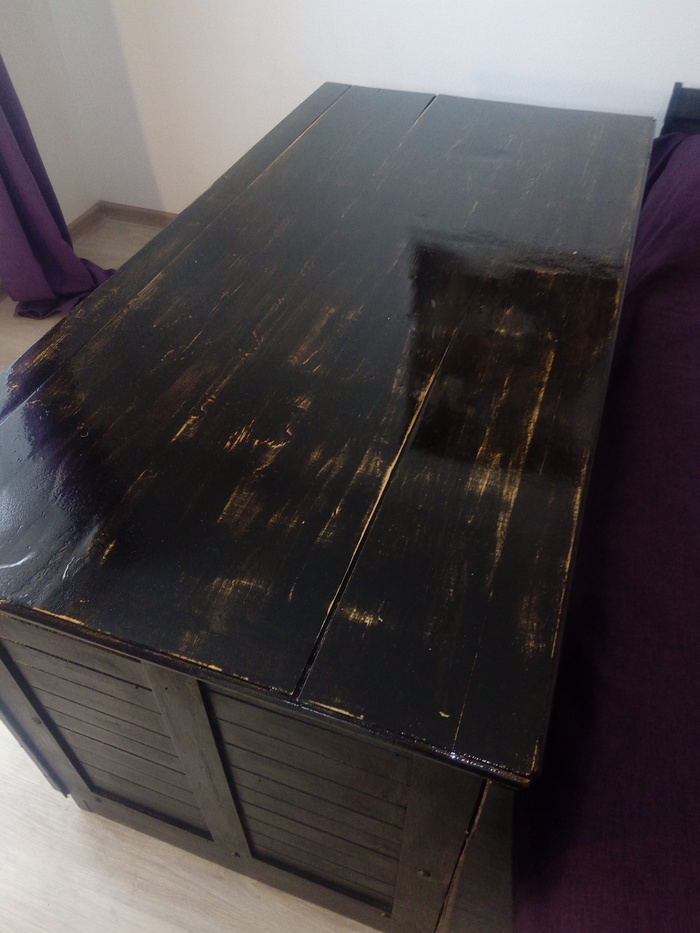 Хорошо снять лак более менее удалось только со столешницы. Как видите, боковые стенки сделаны не из щита, а из реек. Гель проваливался в щели и застревал там. В итоге я потратил много времени, выковыривая его оттуда. Естественно толком очистить щели от лака у меня - новичка в этом деле - не получилось, и было принято решение покрыть эти места алкидной эмалью черного цвета, купленной в Леруа Мерлен за 60 руб. Это было тяжелое решения для меня, так как изначально я хотел сохранить структуру дерева.