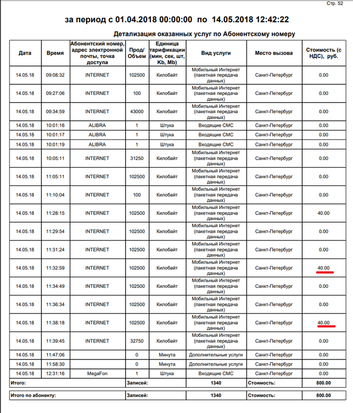 3. В итоге за 4.5 гига (по сайту 300 метров за 40 рублей, а не 250 как писал консультант) я заплатил 600 рублей, а мог 520 за 10.