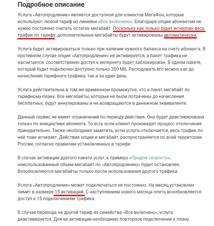 Горя праведным гневом, желая изничтожить все зло на планете, которое как оказалось засело в мегафоне, начал изучать дальше, начиная с начала года. Оказалось что в течении этого полугода, когда кончался трафик интернета, без оповещения в смс о том, что он заканчивается, без оповещения о том, что была подключена какая-то дополнительная опция, списывалось по 40 рублей. Желая разобраться в ситуации, залез опять в личный кабинет, в этот раз рассматривая и читая все что там есть (последний раз самообслуживанием пользовался еще когда был Сервис-гид). Внимание в этот раз привлекло это: