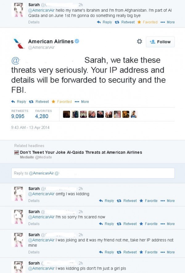 American Airlines: Sarah, мы очень серьезно относимся к подобным вещам. Твой IP и остальные данные будут переданы в наш отдел безопасности и ФБР.