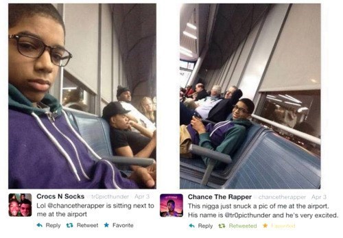 Chance The Rapper : этот мелкий нигер только что сфоткал меня аэропорту. Его имя @tropicthunder и он реально взволнован