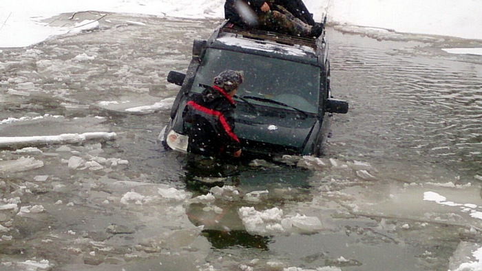Ага. Почувствую… остановлюсь… Как-то так у нас первый ребёнок и появился, ну ты знаешь.Вцепилась я в ручку сильнее прежнего. Поехали. Едем, лёд расталкиваем. Вдруг машина останавливается. Ага, почувствовал что-то, давай выезжать отсюда. А оно не выезжается. Фотографы, ушлые ребята, сразу на крышу полезли. Давай, орут, с нами, щас тут воды полная машина будет. Делать нечего, полезла.