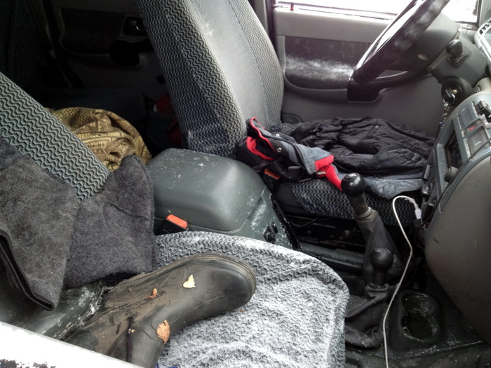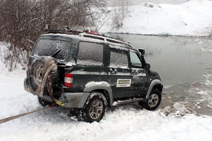 Обиделся, ушёл на другую сторону. Лазит вокруг машины такой деловой, трос прицепляет, следит, чтобы шмотки не уплыли.