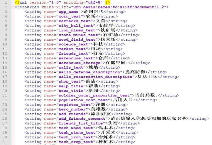 Это стандартный файл локали для игры на Android. То, что в чёрном — нужно перевести, остальное трогать ни в коем случае нельзя