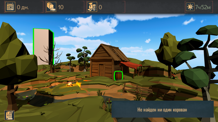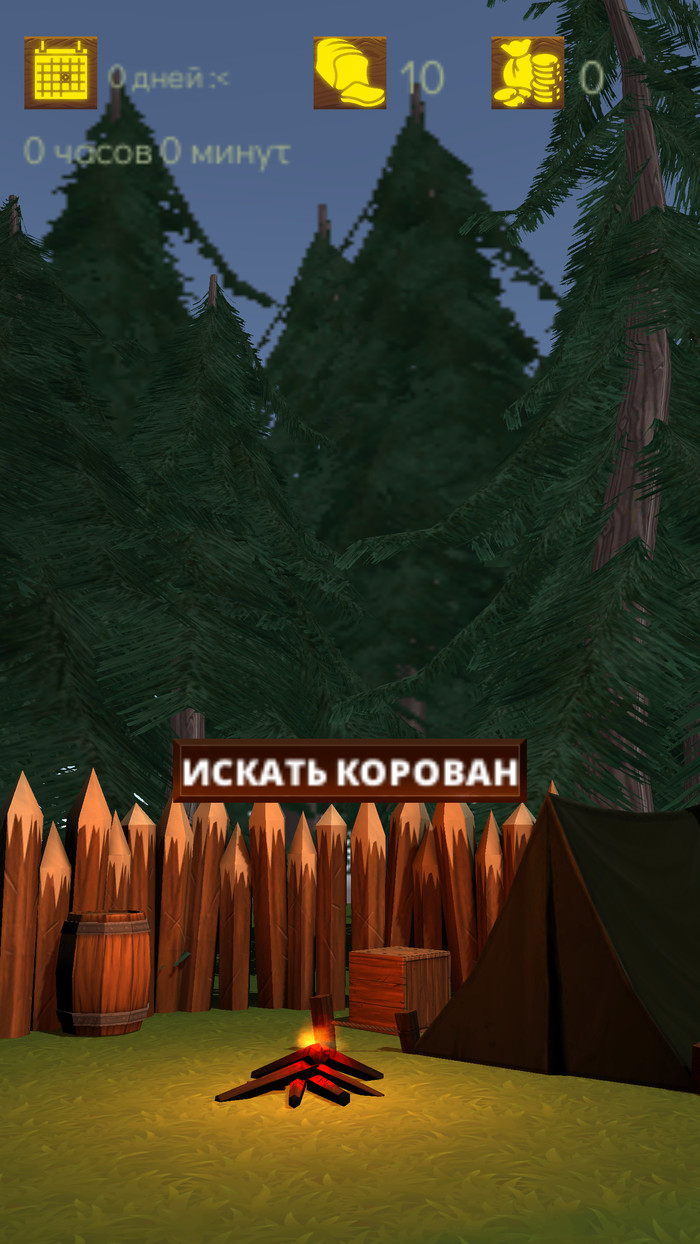 Собственно, геймплей сейчас заключается в том, что вам нужно грабить корованы, при этом прожить как можно большее количество дней. Для этого есть кнопка "Поиск корованов" (самая левая) - вы выбираете параметры корована, который хотите искать. Более мелкие легче ограбить, но они и дают меньше золота. Вторая слева кнопка (над ящиком) - это покупка провизии. Далее - готовка еды и отдых.