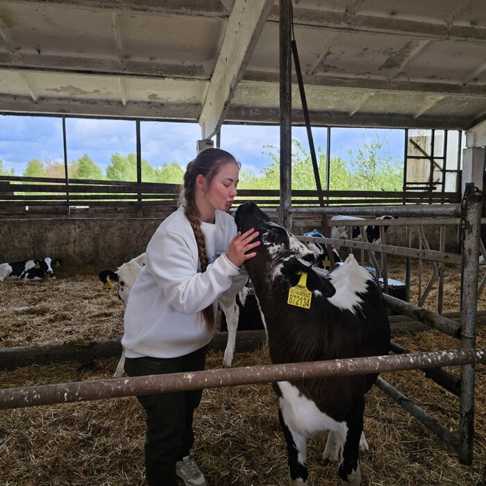 Около двух недель я думала, как же её назвать, долго её разглядывала, следила за её характером, и заметила в ней одну интересную черту: На одном глазу на верхнем веке у неё имеется чёрная полоска, как подводка, а под глазками по одной чёрной точке. И тогда я поняла, что будут её звать Пантомима. Дама она, конечно, с характером. Не любит, когда я глажу других коров при ней, обижается, если пройду мимо неё и даже просто не позову по имени. Как-то я уезжала на учёбу на полторы недели, так она вообще даже не смотрела в мою сторону и уходила. Но несмотря на это, все равно потом мы с ней мирились. Когда шла с дойки или на дойку и видела меня, сразу же бежала ко мне напролом через всех коров.