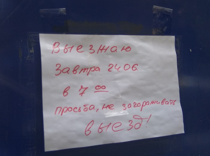 Случилось сегодня утром счастье. Нужно было ехать на работу на автомобиле, а после, по пути сделать работу отвезти груз. Так, как опаздывать на работу нельзя, пришлось ехать на метро. Прощайте планы. Иногда подпирают автомобили во дворе, но оставляют номер телефона под стеклом. Вчера с вечера предпринял, как казалось все необходимое, чтобы выехать. Прикрепил записку на автомобиль.