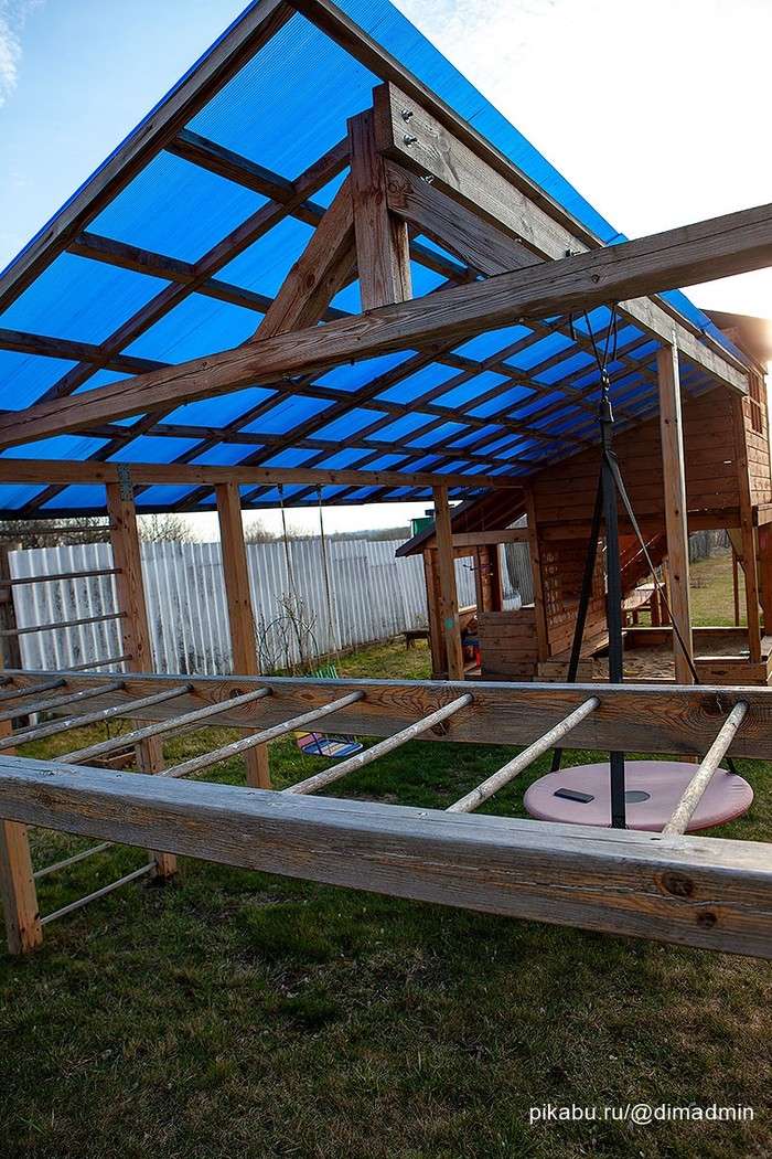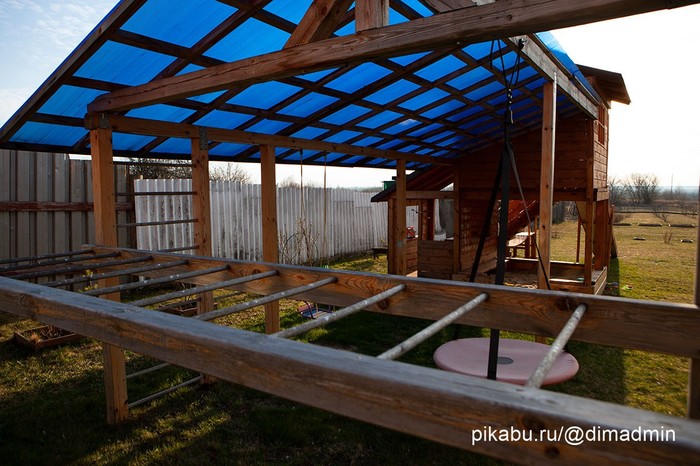 Из 1,5 листов поликарбоната я сделал крышу (теперь все хочу её переделать), для этого я поставил еще пару столбов и протянул еще пару брусьев. Брус, что торчит на переднем плане, торчит не просто так. На лето на него подвешивается канат.