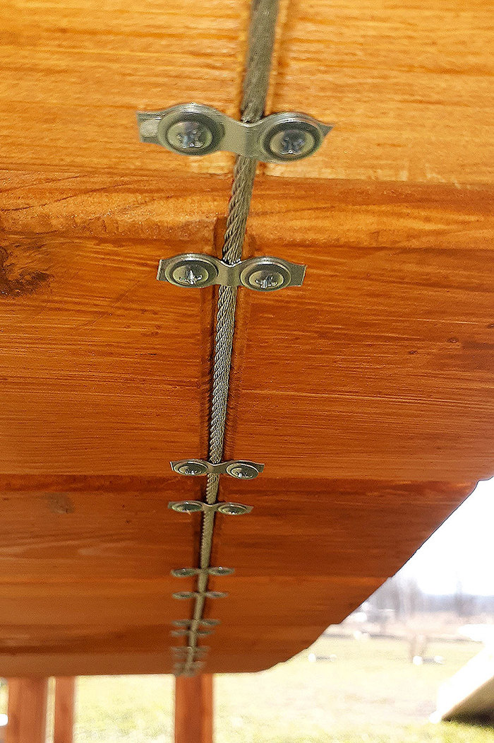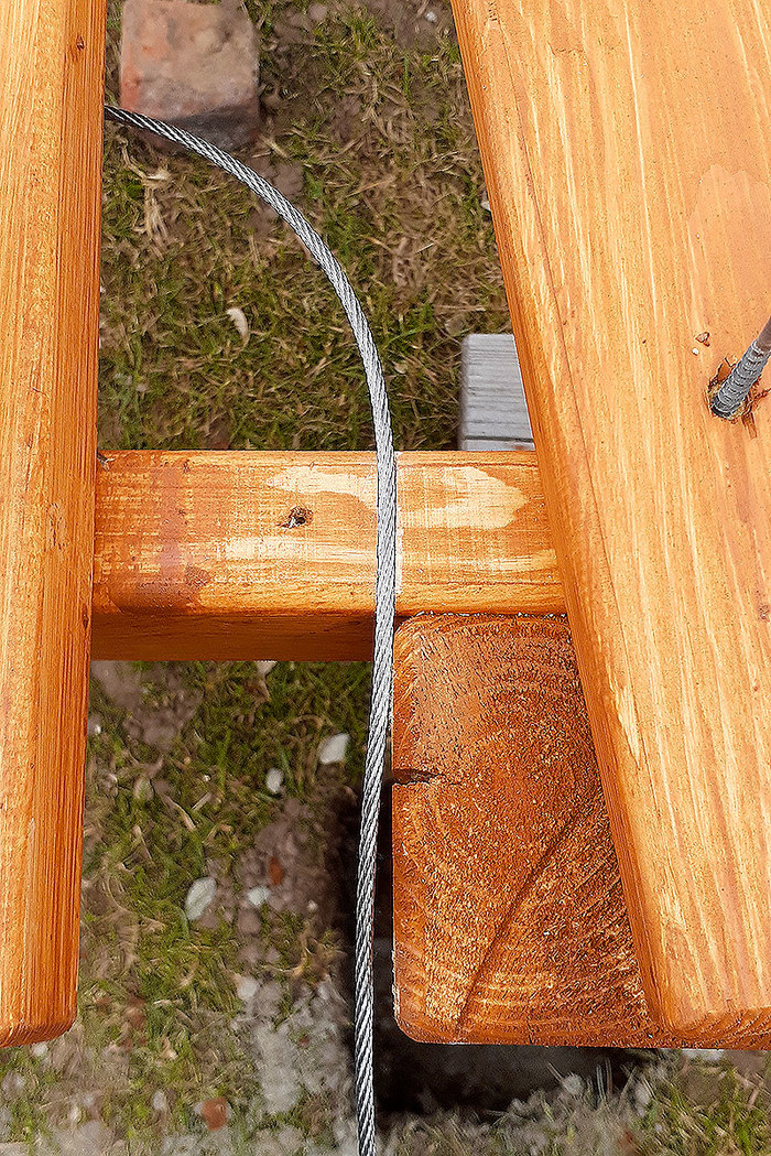 В поперечных брусках я сделал пропил и проложил в него трос.