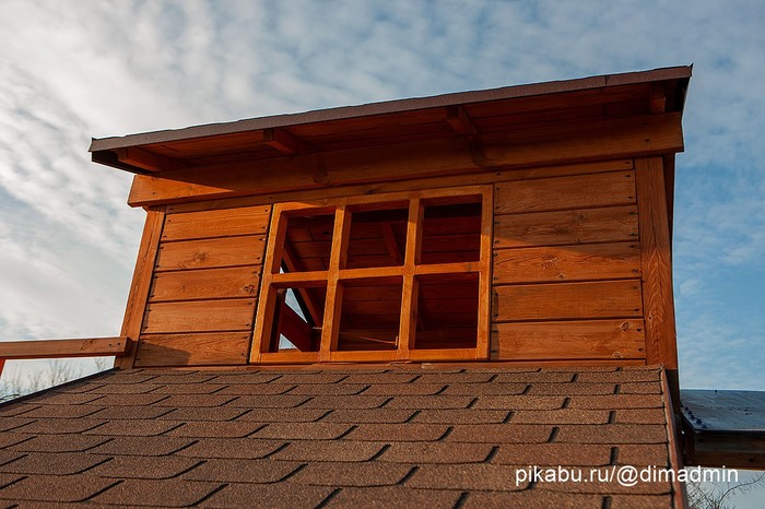 Следующим этапом был домик на первом этаже. Для этого было задействано еще пара столбов из бруса 10х10см. Стены сделаны из самодельной вагонки, причем из различных обрезков и прочей некондиции.