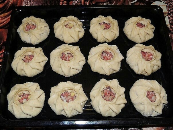 P.S. Тесто делим сразу на 2 части (по 9 кусочков в каждой), и начинку зрительно тоже делю на 2 одинаковые части, и каждую часть равномерно раскладываю на 9 пирогов, таким образом получается в каждом пироге одинаковое кол-во начинки, и никаких остатков.