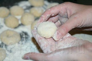 Кусочек теста раскатать в круглую лепёшку, размером с блюдце.
