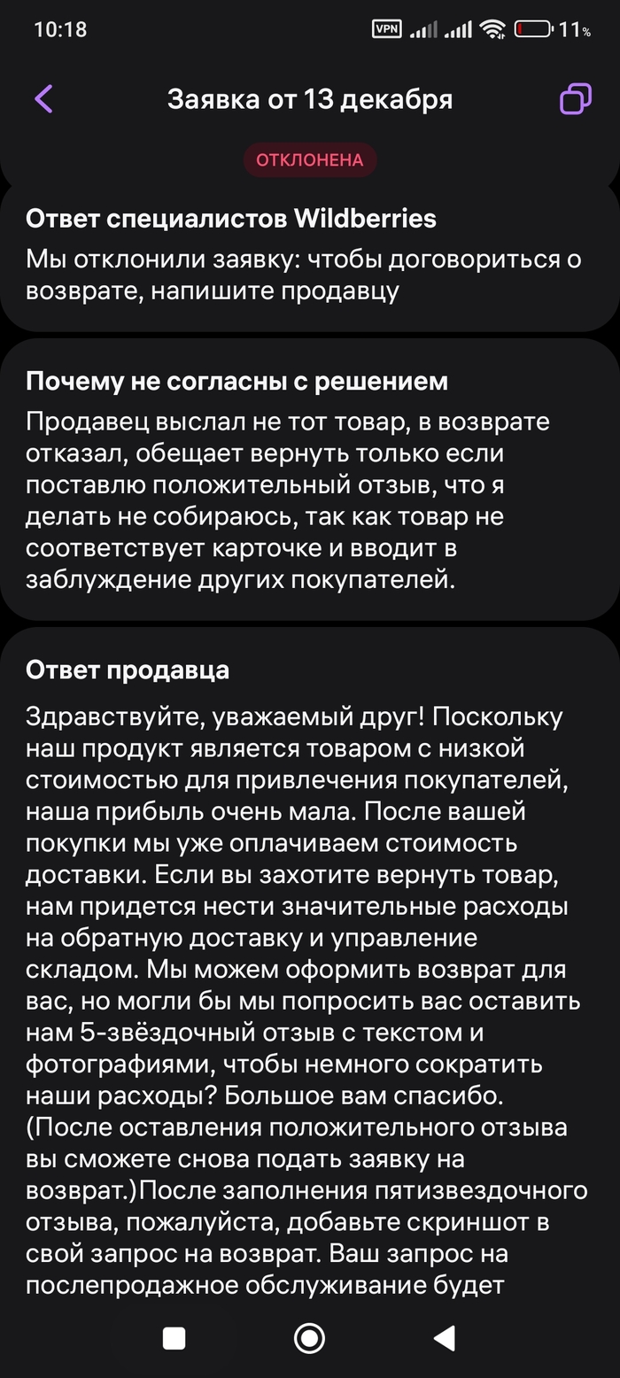 Заказал наклонный кронштейн в Вайлдберриз с пружинной фиксацией, продавец прислал самый дешёвый не наклонный с фиксацией винтом. В возврате продавец отказал, предложил вернуть деньги за положительный отзыв. Я обострил спор, перевел решение в Вайлдберриз, указав, о шантаже продавца и введение в заблуждение покупателей. В итоге Вайлдберриз отказывает и предлагает всё-таки договариваться с продавцом. Т.е. Вайлдберриз защищает обманщиков продавцов и отказывает добросовестным покупателям в возврате, формируя положительные отзывы для продавцов обманщиков.