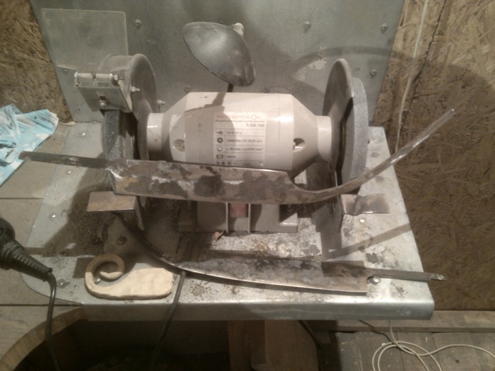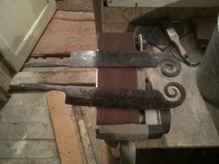 После отковки, на наждаке грубо поровнял спуски. Спуски сделал от обуха, линзовидные. Носы, таки, не получилось сделать одинаковой толщины, лишнее спиливал болгаркой и ровнял наждаком