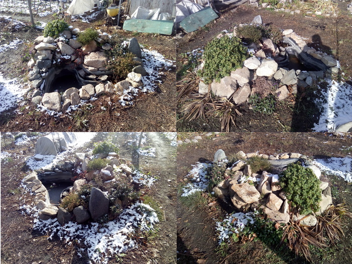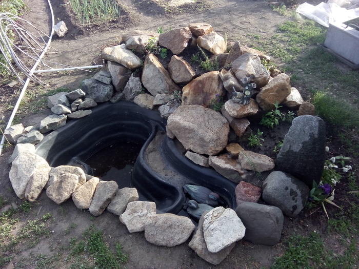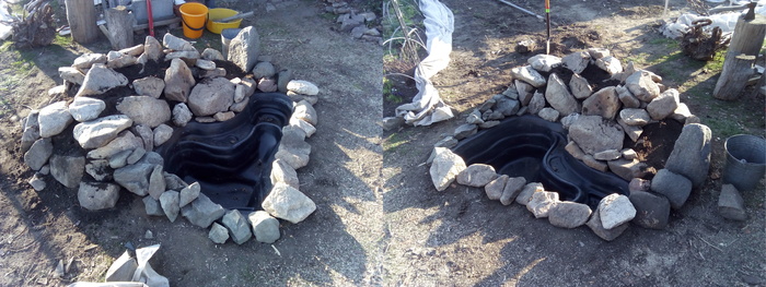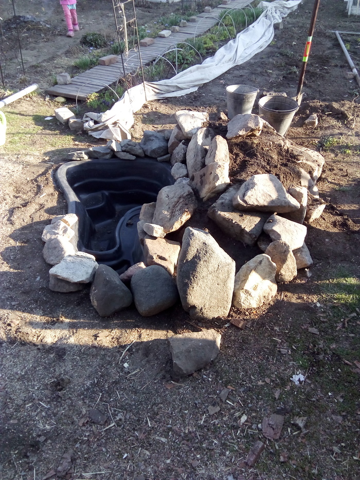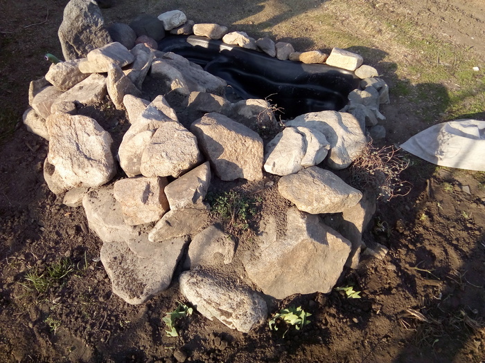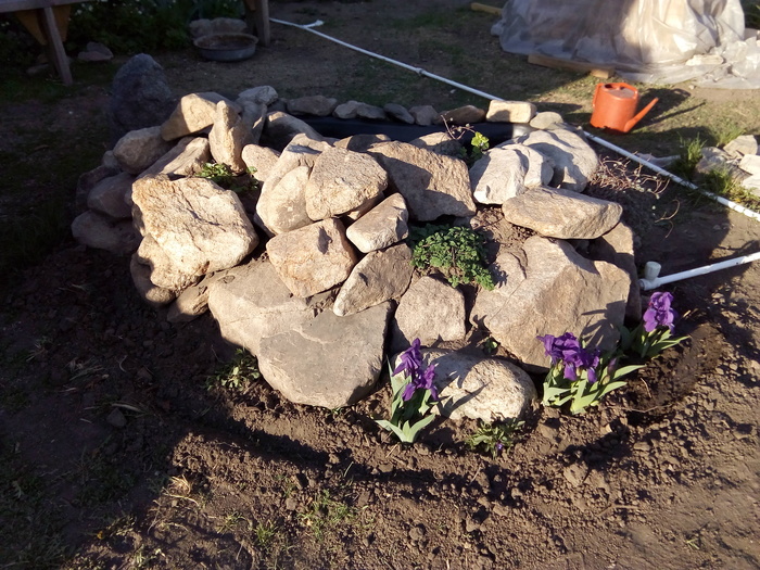 Наступила весна. И вместо неудачного сооружения из труб решили соорудить каменную горку с прудиком. Котик недоволен - Тепло, солнышко. Надо валяться и нежиться, а им не сидится!!!