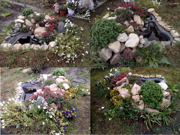 Для этого на ней высадили: колокольчик Нирембергия, Лобелия, Мята, Анютины глазки, Вербена, Камнеломка, Ирисы, Ромашки, Тюльпаны, Очиток розовый, Катарантус, Питуния.