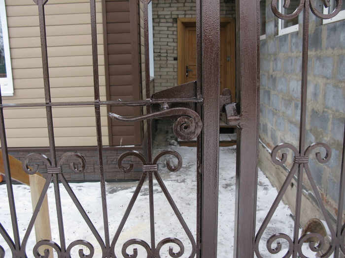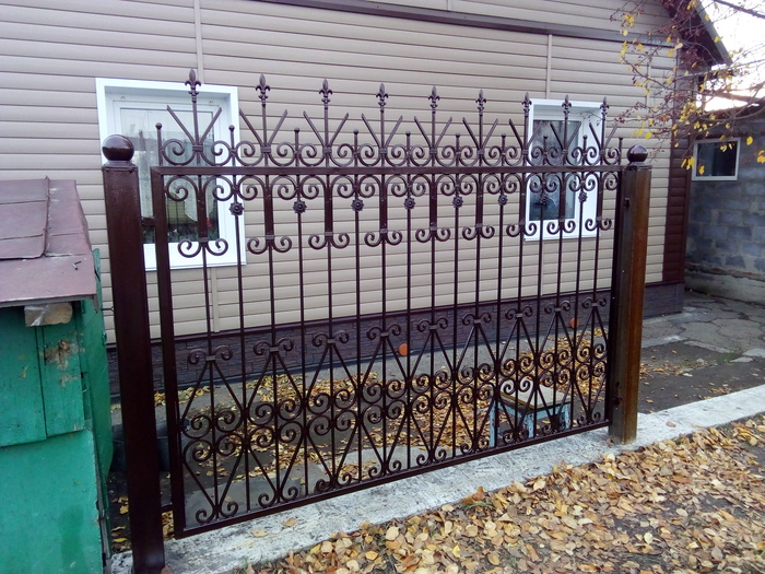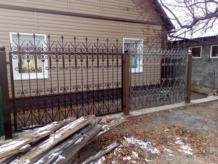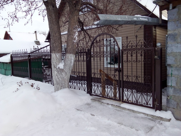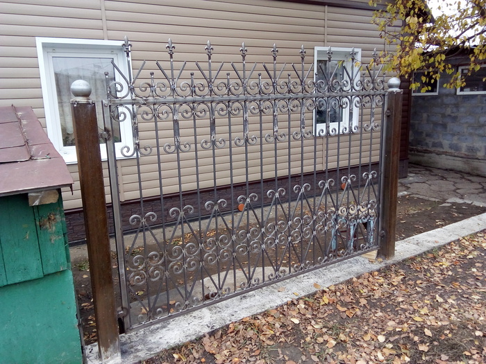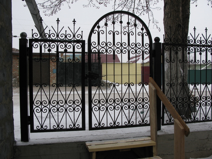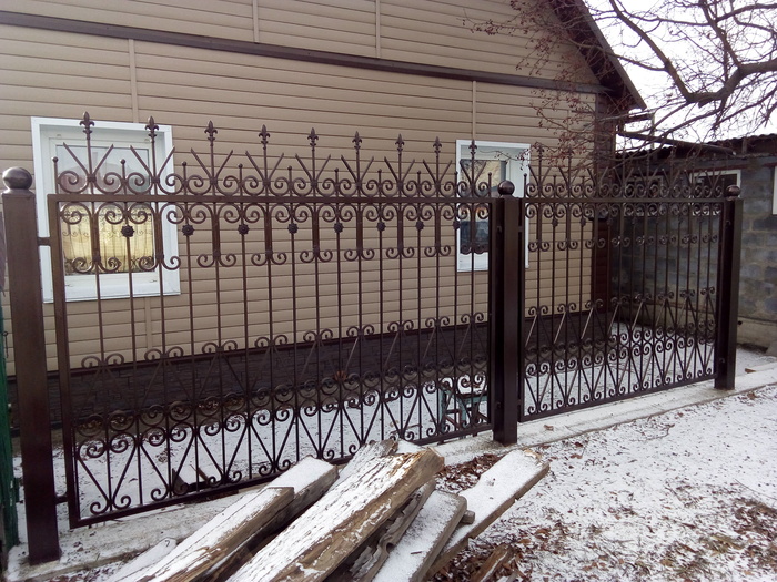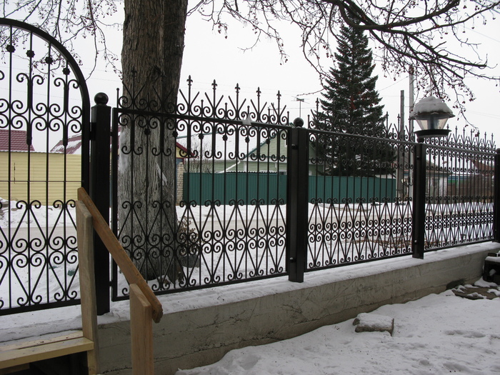А это вид с улицы. Летом докрашу недокраски. Обжимки и цветы посеребрю методом сухой кисти. )) Предлагал жене пару окончаний пик покрасить красным, но она против.