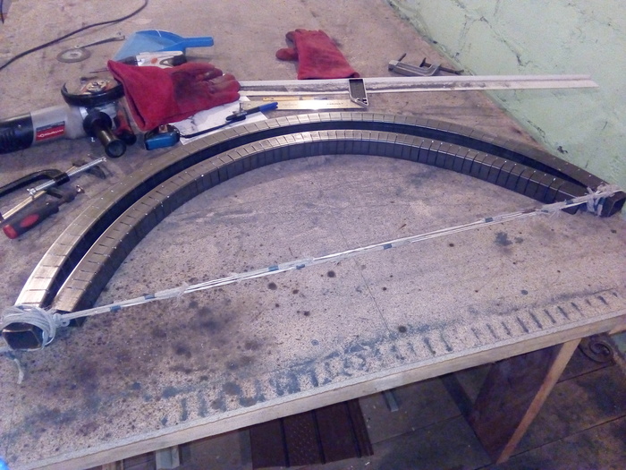 В своём городе не нашёл где можно изогнуть дугой профильный квадрат 40*40. решил делать методом пропила и последующего изгиба. Посчитал у нарисованной дуги длину верхней и нижней линии нашел разность и посчитал сколько надо убрать снизу, чтобы получить такой изгиб. И начал пилить...