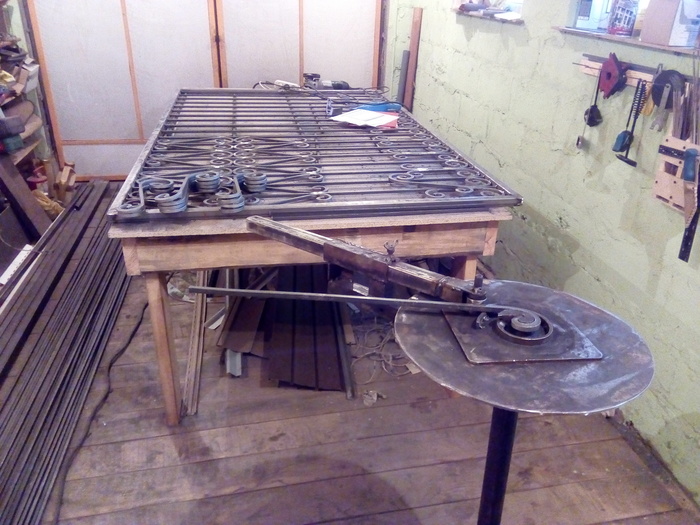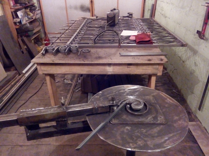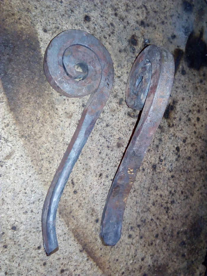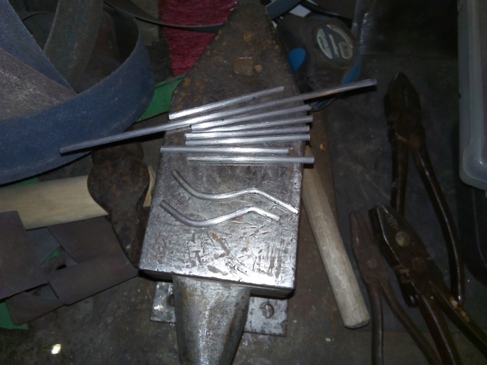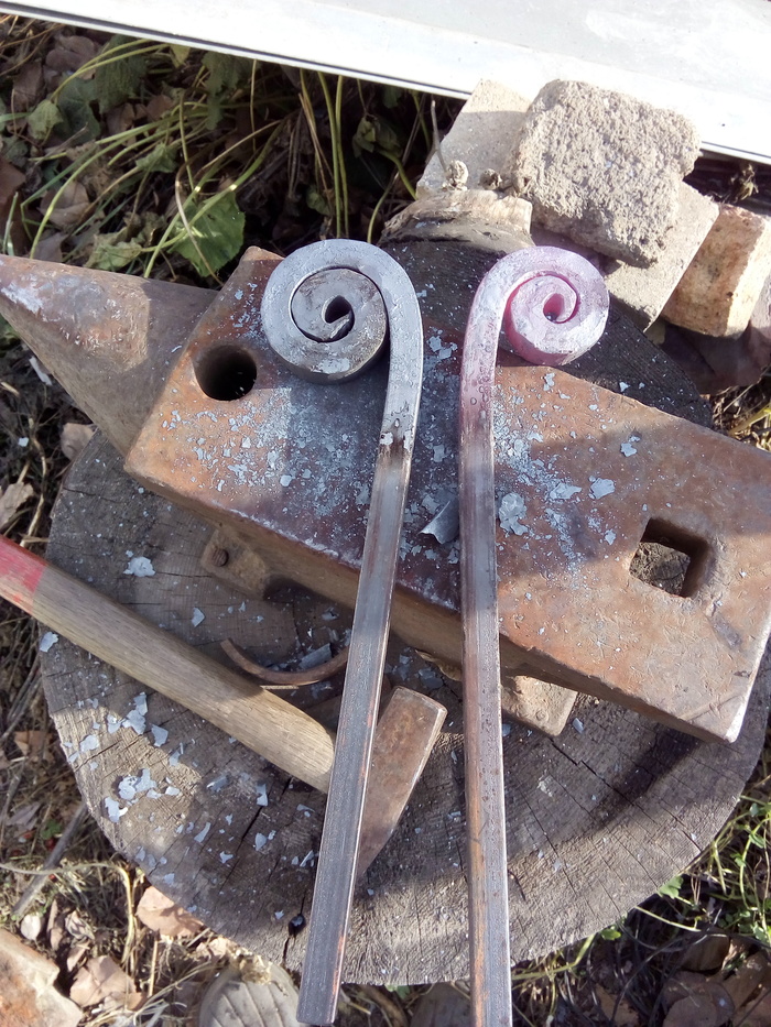Изгибаю кренделя партиями. И партиями обрабатываю. Из-за неровности в сечении квадрата у прута улитки выходят кривыми в плоскости и приходится их править молотком. Потом долго подгонять под межпрутный размер.