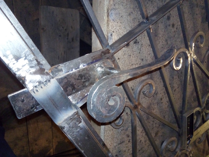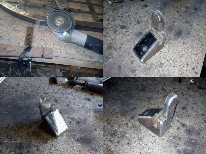 Из полосы в 10мм выпилил и собрал ответную планку. Ответная планка собрана из трёх слоев. Высокий, округлый стопор приварен отдельно. Швы заварил и зачистил. ) Монолитом она выглядит солиднее. Площадку, по которой будет скользить язычок защелки сточил под небольшим углом.