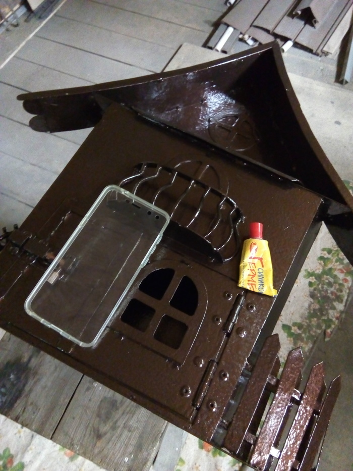 Домик покрасил шоколадной молотковой краской в цвет забора. Вместо стекла использовал чехол от телефона. Щели промазал силиконовым герметиком.