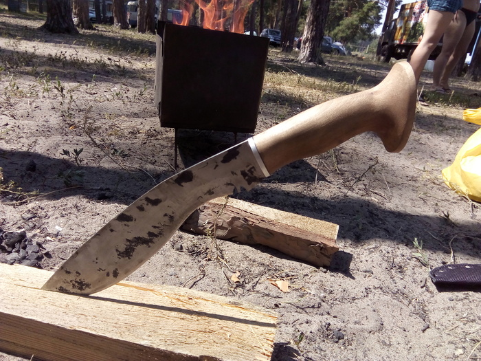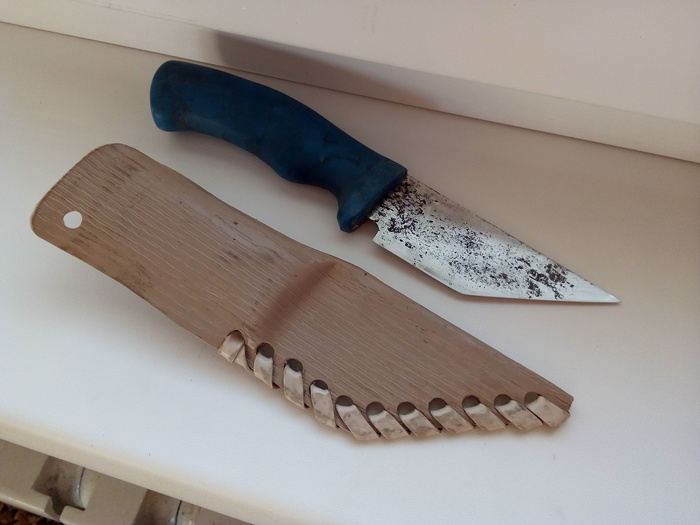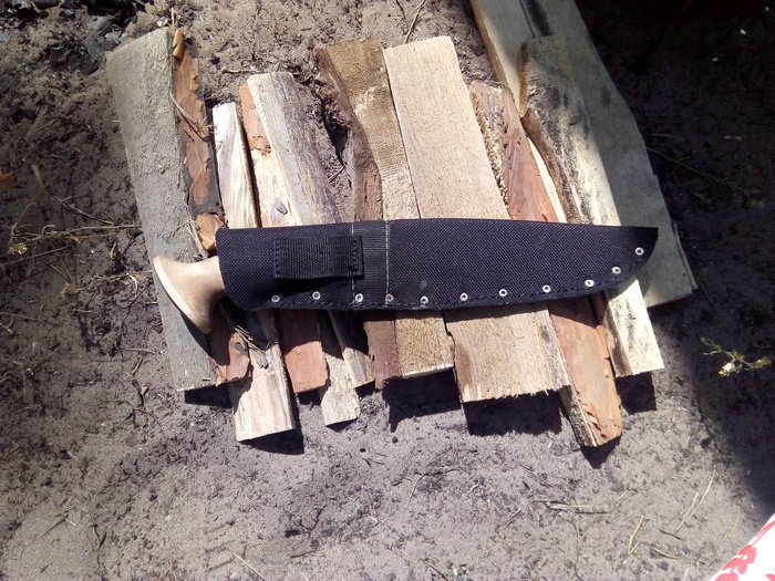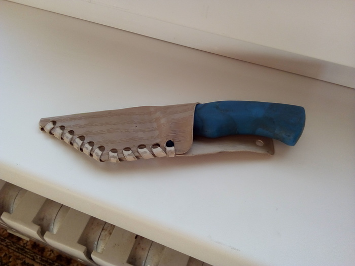 Лезвие - нержавейка. Давным давно дед с завода принес полоску нержавейки, но ничего с ней так и не сделал. Мне пригодилась. Немножко потвёрже обычных китайских ножей из магазина.