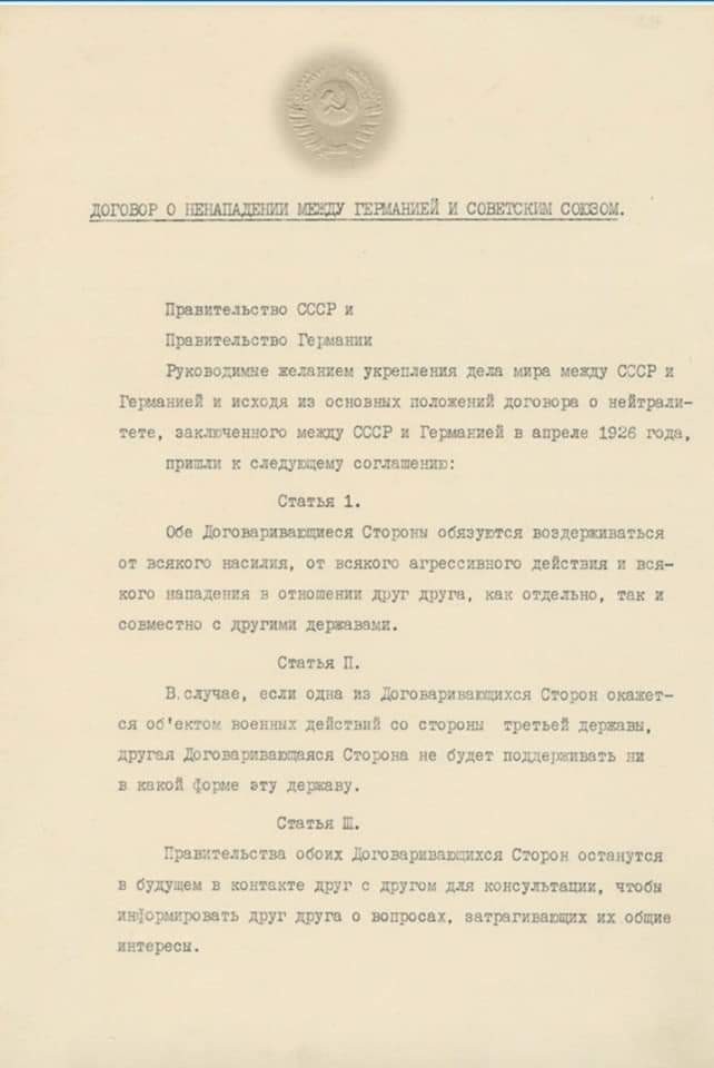 Советские оригиналы Договора о ненападении между СССР и Германией, заключенного 23 августа 1939 года, а также секретного дополнительного протокола к нему впервые опубликованы 31 мая.